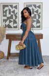 Woven Washed Denim Sleeveless Halter Maxi Dress with Smocking Back